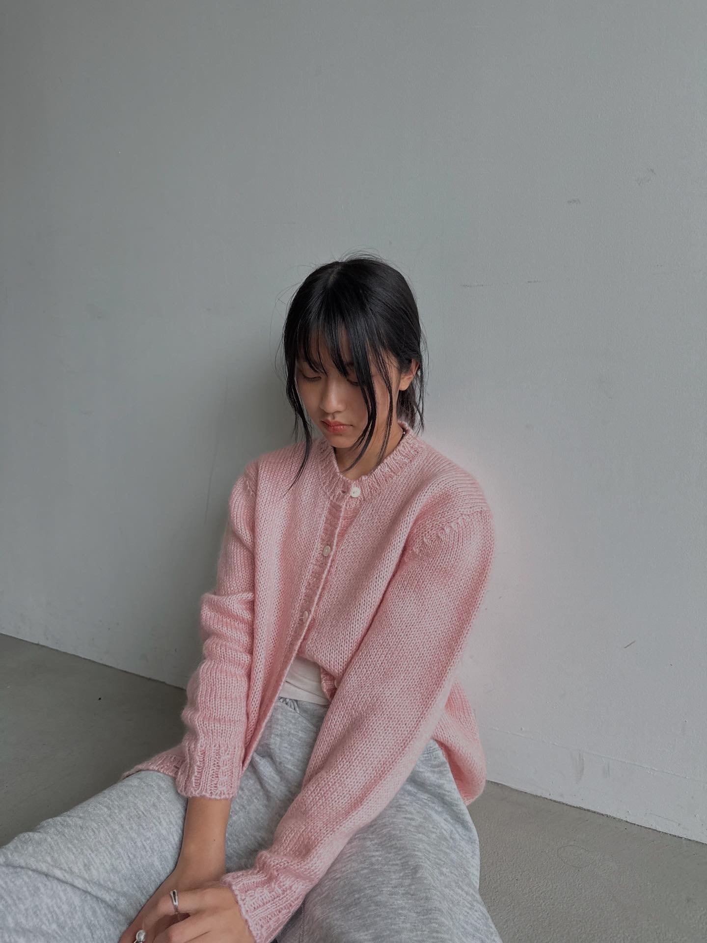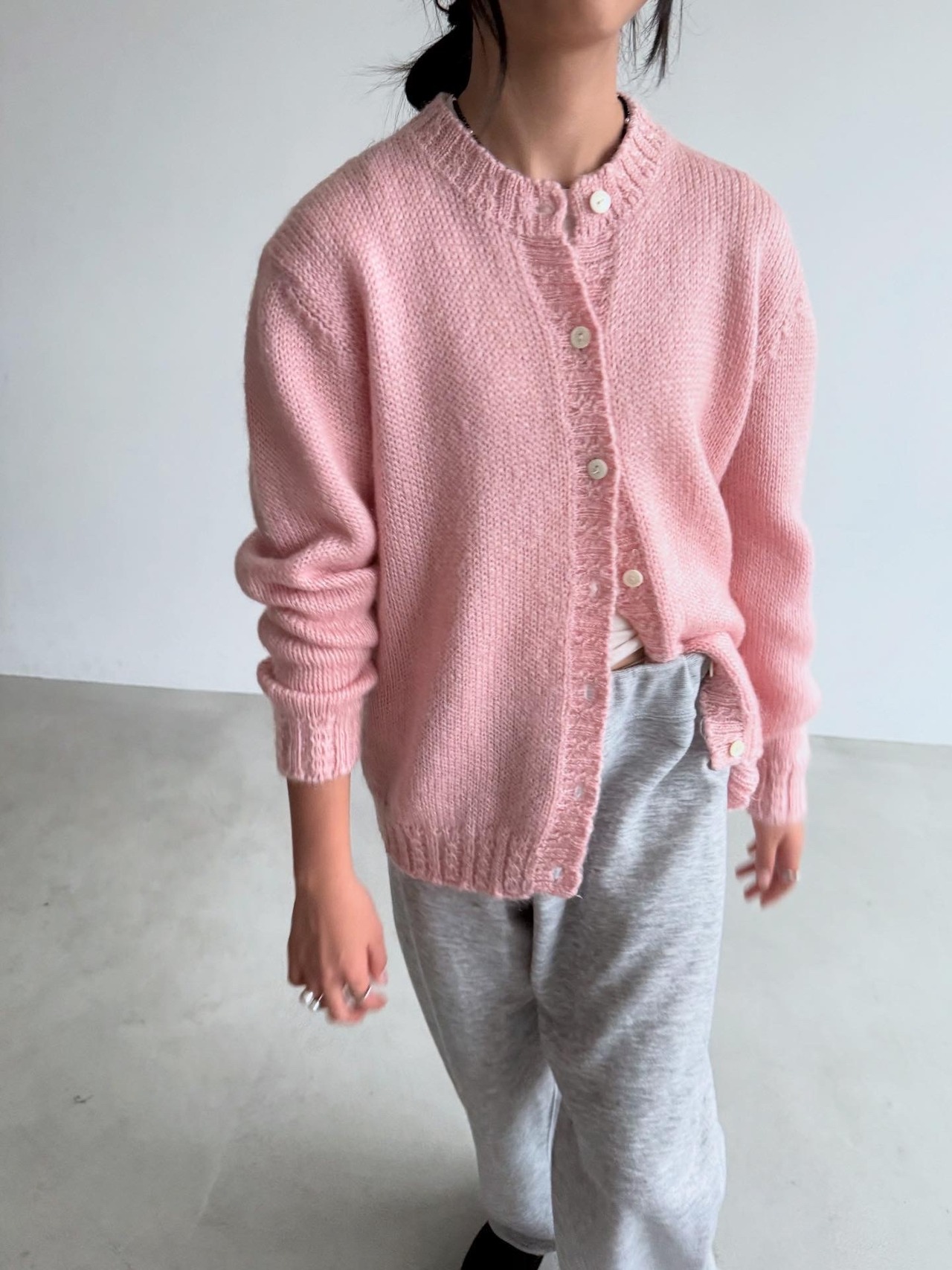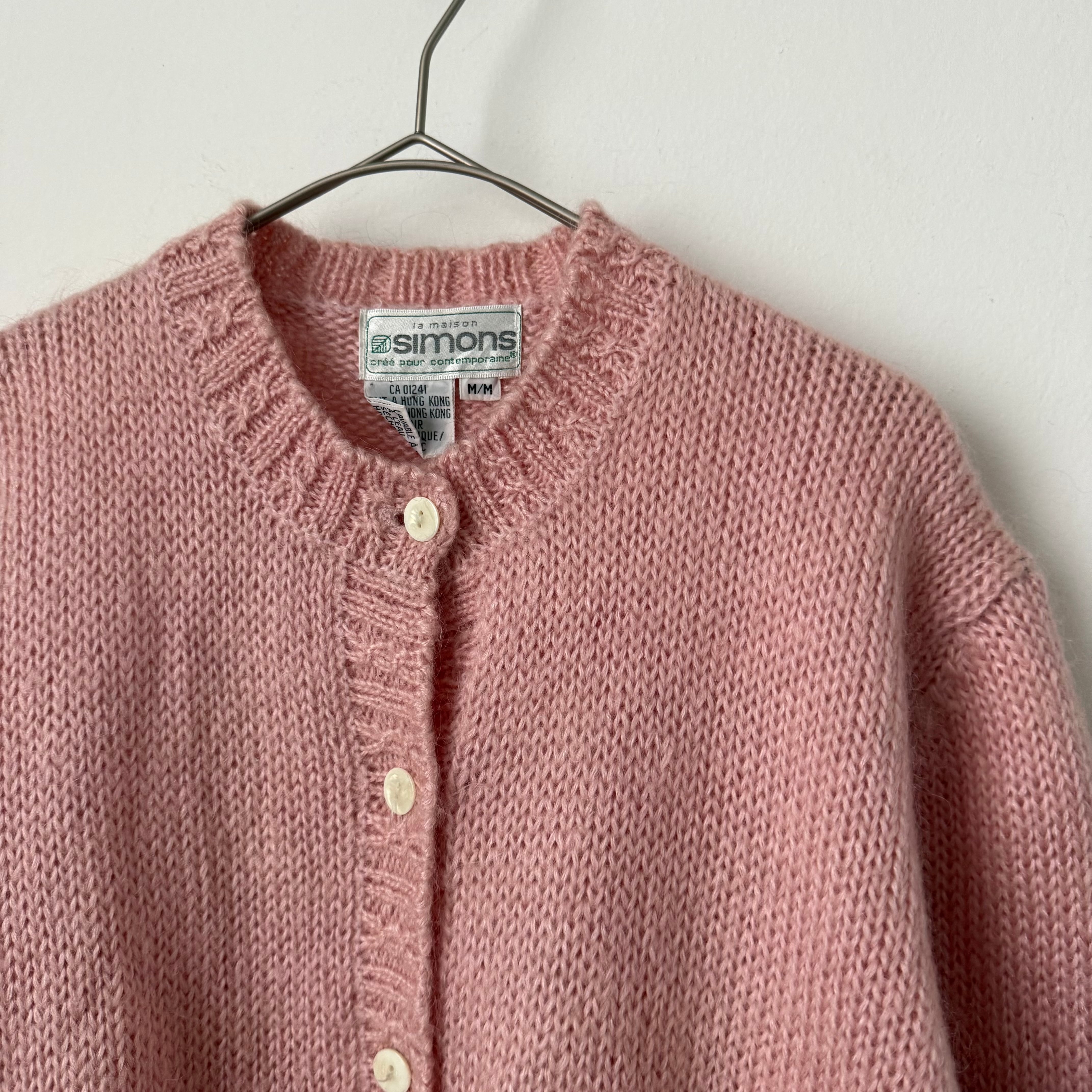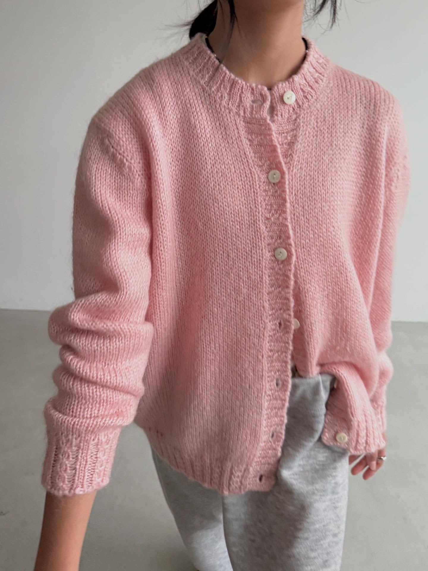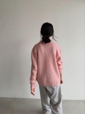 パステルピンクカラーで差し色にも使いやすいモヘアカーディガンです。